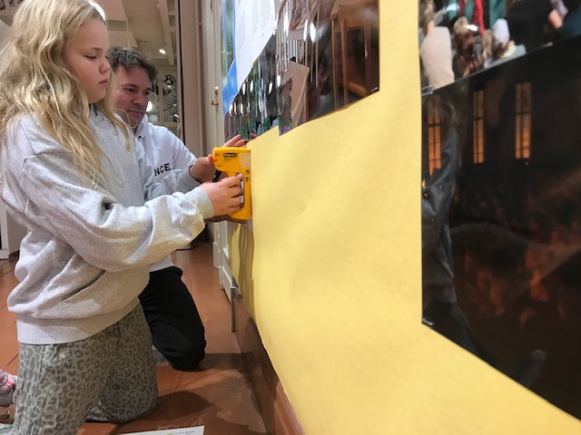 Ripustamispäivänä kaikki materiaali oli kasassa. Apulaisiakin ilmoittautui töihin. Vähitellen seinille nousi Viestin vuosikertoja sekä tietoja ja kuvia niissä kerrotuista asioista. Kaikille riitti hommia. Kahden päivän aikana kävi näyttelyä pystyttämässä kolmisenkymmentä aikuista ja reilusti yli kymmenen lasta.